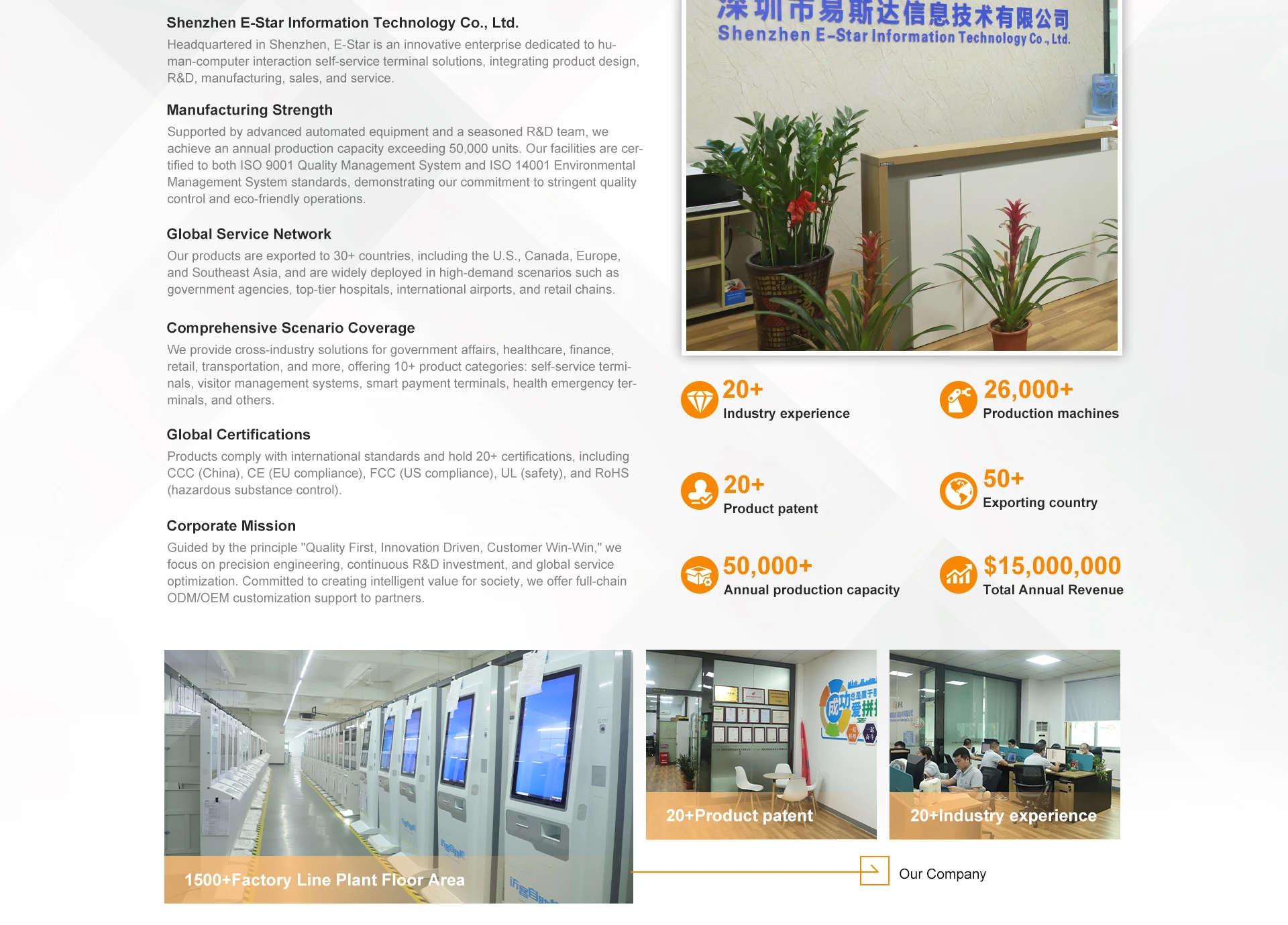 Productos principales:Quiosco de autoservicio, quiosco de pago, quiosco de hotel, quiosco de estacionamiento